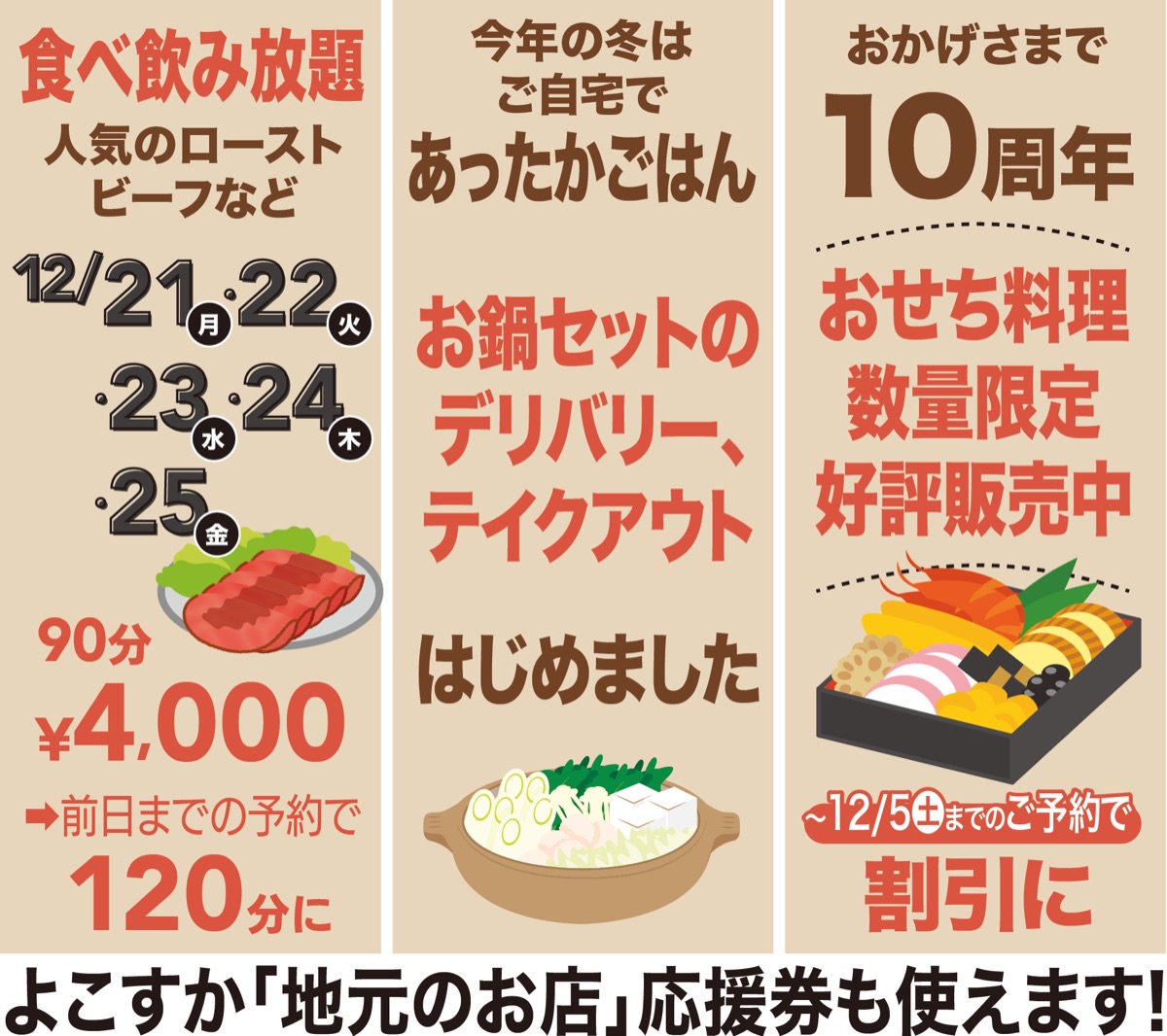 そのほか、寄せ鍋やすき焼きのデリバリー・テイクアウト、食材にこだわったおせちの予約も受付中。12月21日(月)〜は和洋折衷の料理が楽しめる食べ飲み放題もあり。詳しくはHPで確認を。