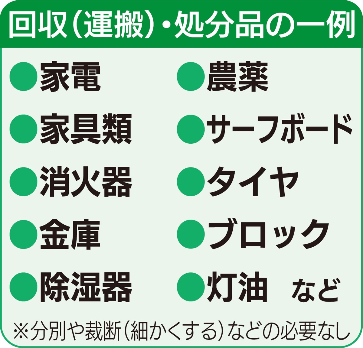 電話1本で迅速に対応。個人では運搬が大変な家電や家具類、手に負えない膨大な量の廃棄物も回収(運搬)と処分を一括して請け負ってくれる。面倒な分別や裁断の手間も不要。値がつくものは、その場ですぐに買い取ってもらえる。