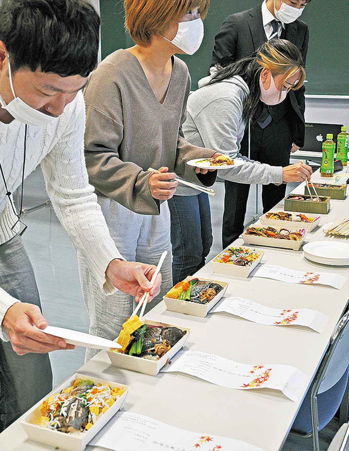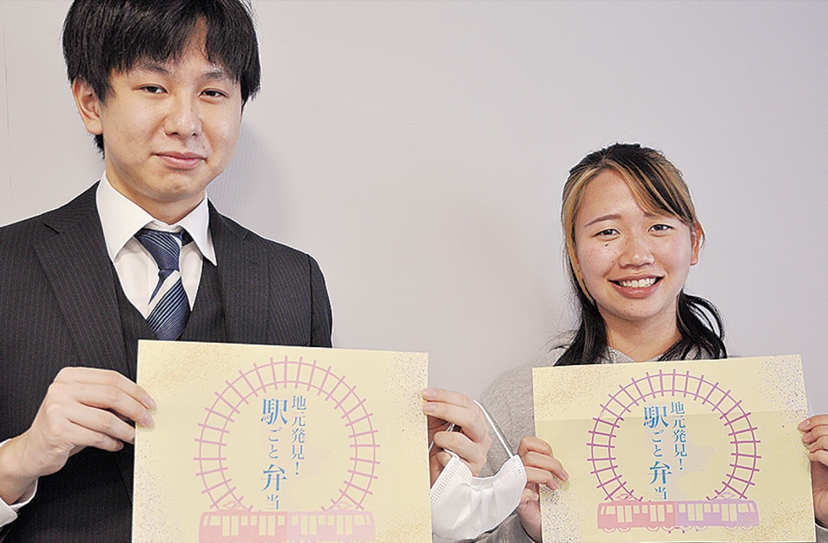 追浜地域の街づくりについて学んでいる立教大学法学部のゼミ生8人が、企画段階から参加。のしのデザインも手掛けている。京急・JRの電車と円になった線路を組み合わせたもの。法学科3年の加藤正也さん=左=は「電車だけでなく、お弁当で地域が『つながる』ことを意識した」と話し、今後の展開に期待を寄せた。