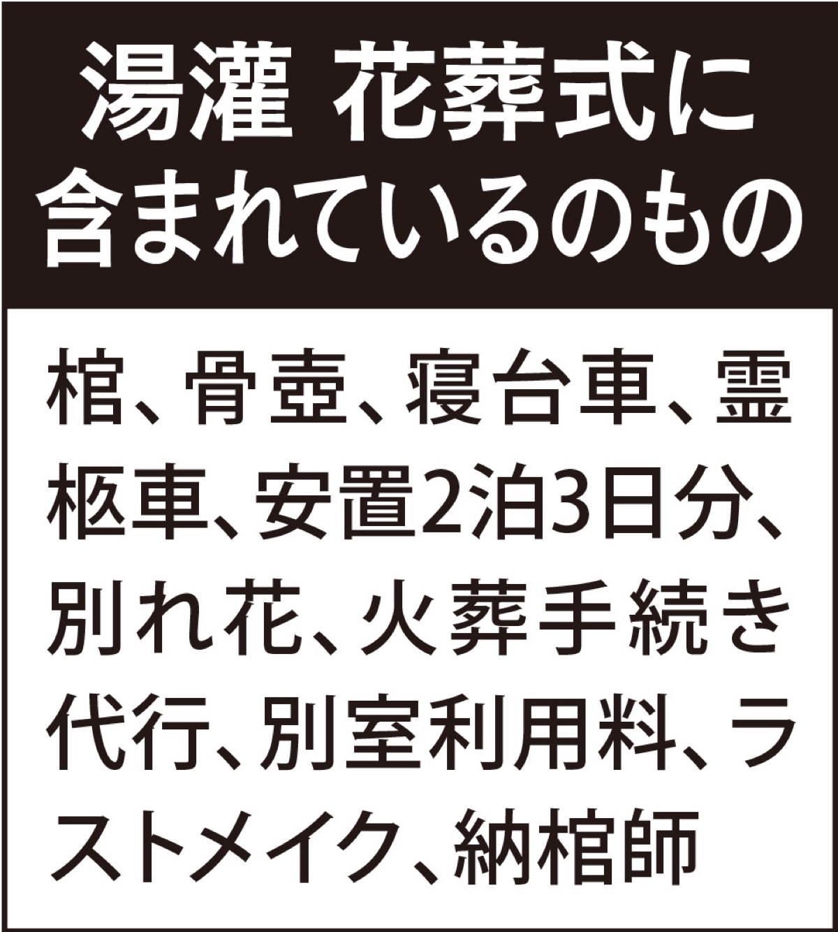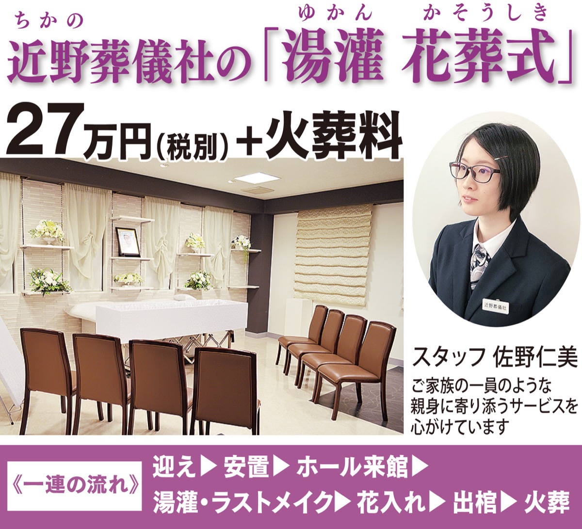 中心となるのは、「湯灌(ゆかん) 花葬式(かそうしき)」と名付けられたプランで料金は総額27万円+火葬料(利用する部屋によっては28・8万円+火葬料)。自社ホール(斎場メモリーロードちかの)内の小規模スペースを使用し、家族中心の「お別れ」をして送り出す=上図参照。火葬場に直接集合する「火葬式」なら総額15・8万円+火葬料(※火葬料以外はすべて税別)。