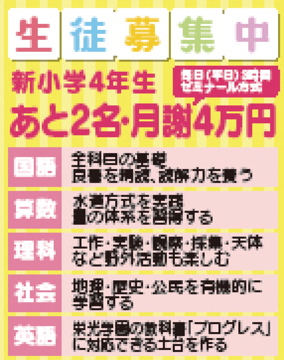 「知的好奇心の育みとLong slow distance(ゆっくりと長く行く)」がモットー。久里浜出身で大手進学塾の教科長を務めた実績のある塾長が、予習―授業―復習を繰り返すゼミナール方式で、教科書の基礎から指導する。量より質にこだわり、実験や観察、野外に出るなど机の上だけではない学習も展開。最終的には受験の合格ラインまで到達することを目標とする。