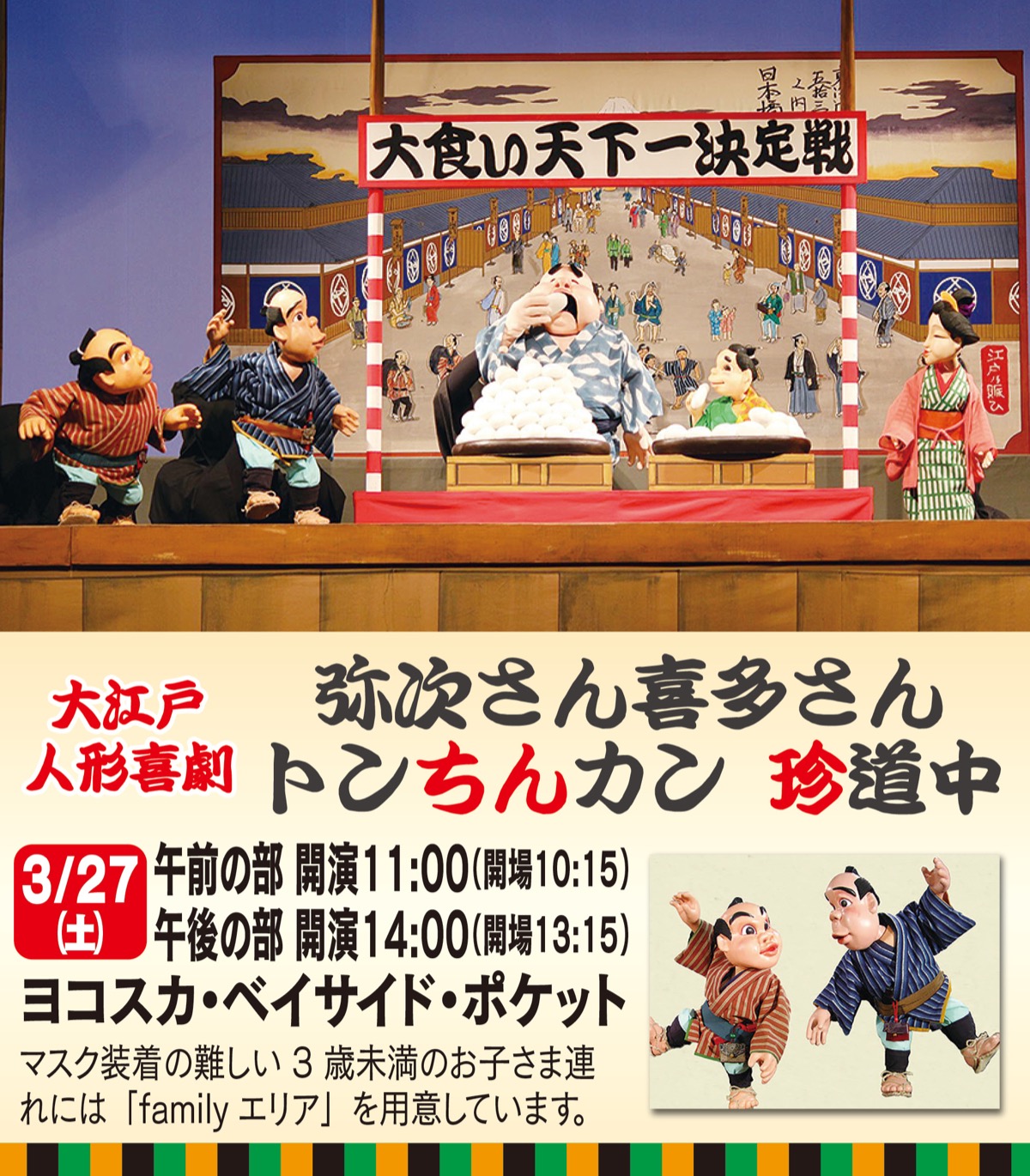 まんじゅうの大食い大会で騒動を起こし、江戸を追われた弥次さんと喜多さん―。お伊勢参りに出向いた二人の先々で起こる騒動の「大珍道中」を描いた人形劇が3月27日(土)、よこすか芸術劇場で催される。