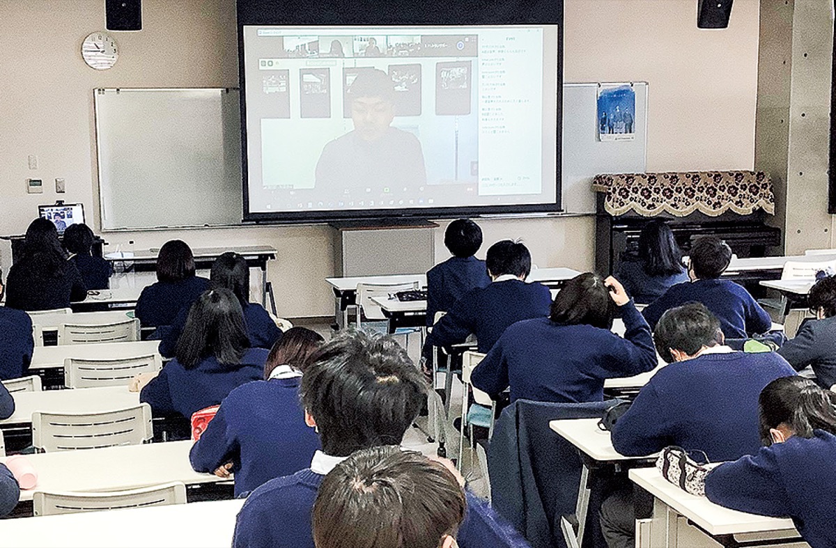 東日本大震災から10年が経過することを受け、湘南学院高校1年419人は今月10日、宮城県石巻市で「語り部」として活動する永沼悠斗さんとオンラインでつながり、その体験から教訓を学ぶ防災学習を行った=写真。