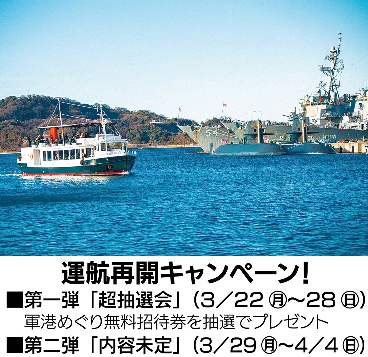 3月22日から28日(日)までの第一弾は「超抽選会」と銘打って、乗船者に軍港めぐり招待券をプレゼント(平日各便5枚/土・日・祝日は各便10枚)する。第二弾は3月29日(月)から4月4日(日)まで。内容は近く発表される。