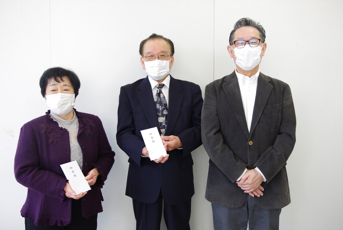 コロナショックに見舞われた今年度は、「まん仲大市」を中止したが昨年7月から再開。各団体へ3万円ずつ手渡した。河邉会長と横山分団長は「地元の福祉のために有効に使わせていただく」と謝意を伝えた。