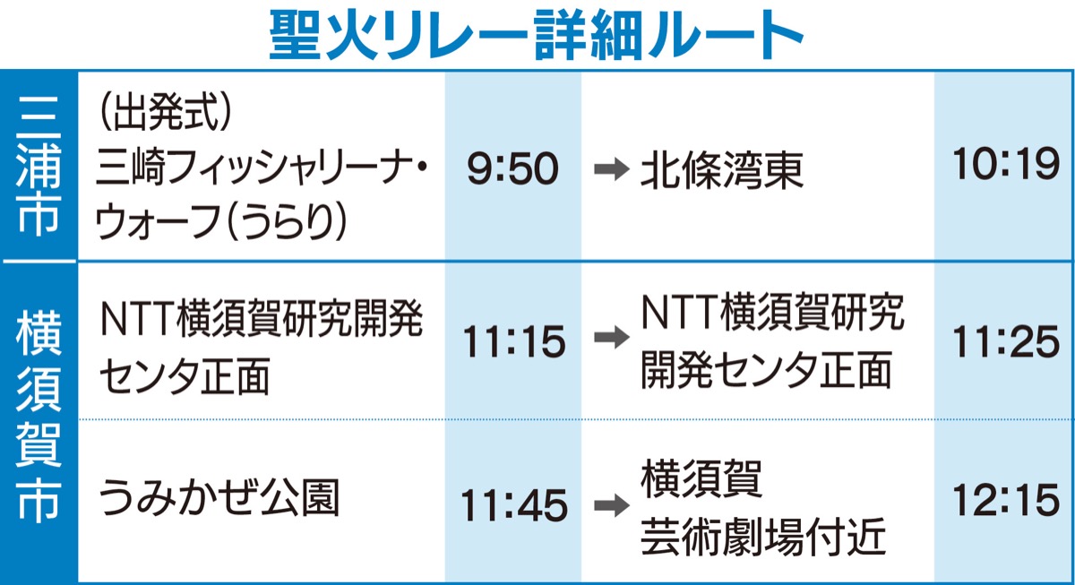 横須賀市内を走るのは同月29日(火)。三浦市の三崎フィッシャリーナ・ウォーフ(うらり)での出発式からスタートし、市内ではNTT横須賀研究開発センタ正面の周回コースとうみかぜ公園〜横須賀芸術劇場付近の2カ所を聖火でつなぐ。