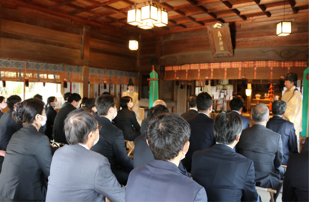 同社は関東圏内を中心に建物(マンション・ビル)の大規模修繕などを手掛ける改修工事業者。以前、森戸大明神の参集殿の改修工事を請け負った縁もあり、昨年から入社式をこの場所で実施している。当日は厳粛な雰囲気の中、新入社員14人は役員らとともに本殿で祈願をささげ=写真=、絵馬にそれぞれの目標を書いて奉納。新入社員のひとり、山越一生さんは、「コロナ禍ではあるが、このような入社式を開催いただき感謝している。一日でも早く会社で活躍したい」と話した。岡田社長は「コロナ禍の中、新社会人として期待や不安はあると思うが、努力と感謝で頑張ってほしい。地元企業として、地域との更なる縁を深めてほしい」と激励した。