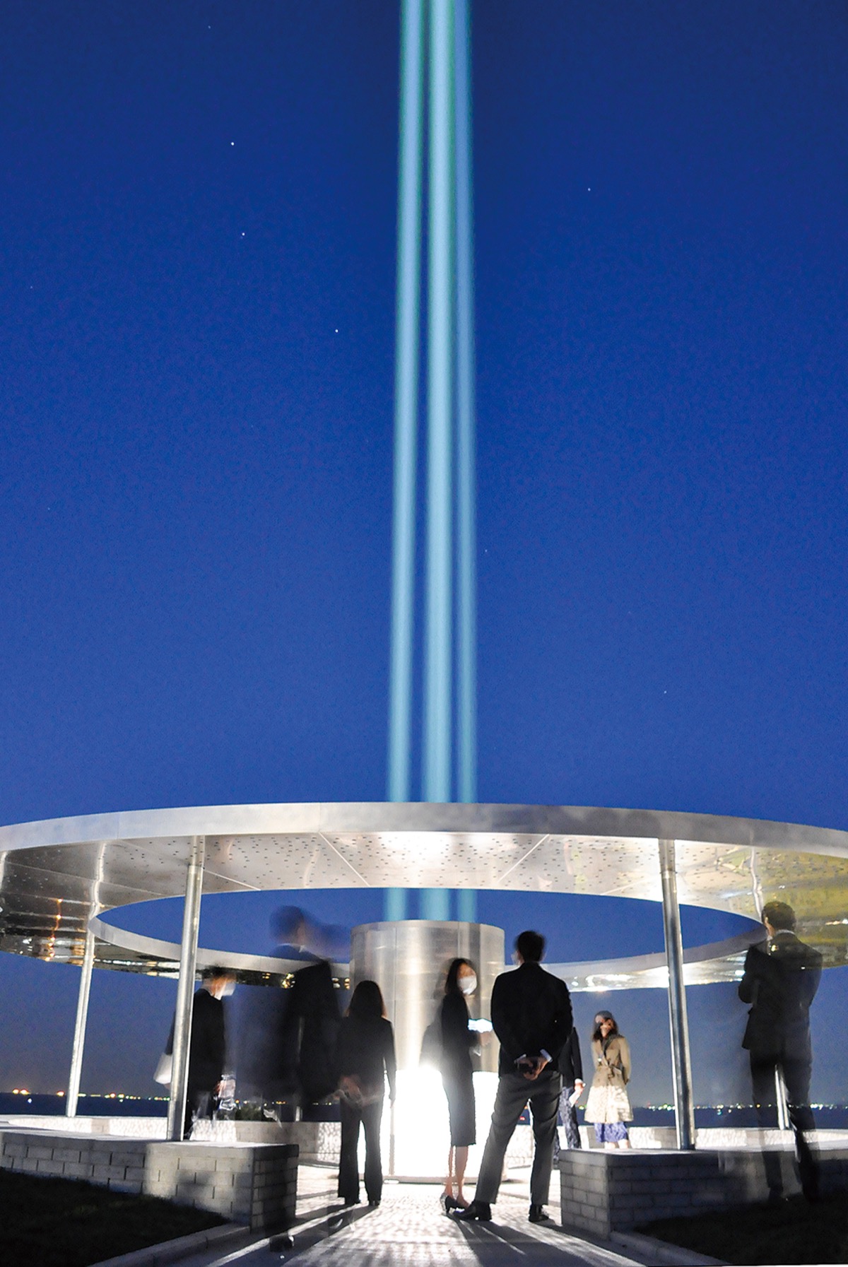 同日夜に平和モニュメントの点灯式が開かれた。上地克明市長、板橋衛市議会議長、デザインなどの企画・監修を担当したパノラマティクス、齋藤精一氏が点灯スイッチを押すと、ブルーの光源が昇り竜のように上空を駆け上がり、拍手と歓声に包まれた。