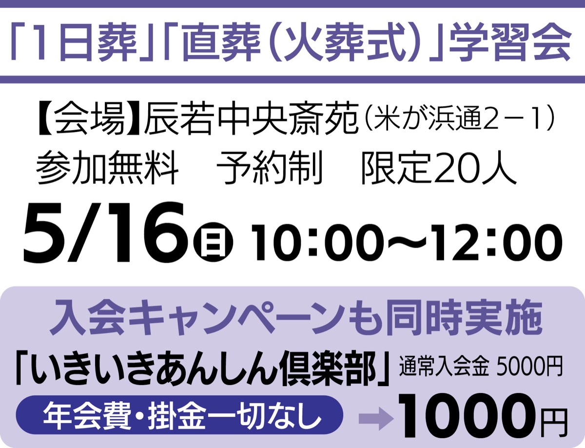 葬儀の主流になりつつある家族葬や一日葬、直葬の費用、形式についての質問に応じる個別相談会も5月5日(祝)・11日(火)・16日(日)・22日(土)・28日(金)、6月3日(木)に実施する。参加無料。辰若中央斎苑、エニシア佐原、辰若本社、エニシア米が浜の4会場。午前10時から午後2時で予約制。