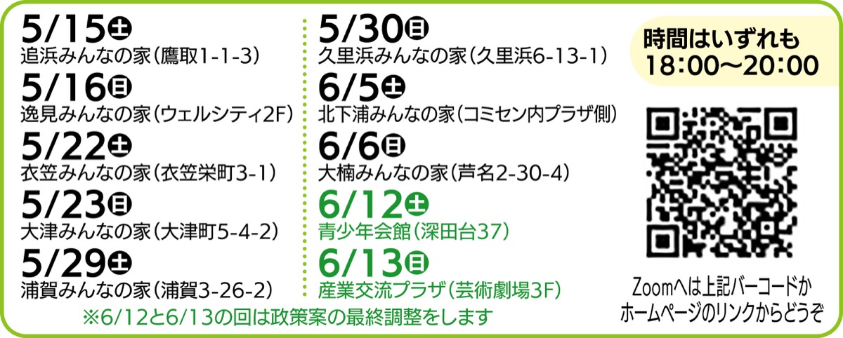 そこでみんなの願いが埋もれないよう、「見える化」して市長候補に届けることにしました。今後、市内10会場で開催する『井戸端会議』にて、ご意見を伺います。対応可能な方はZoomでのオンライン参加をお勧めしています。途中参加・退出も自由で、お子さま連れOKです。