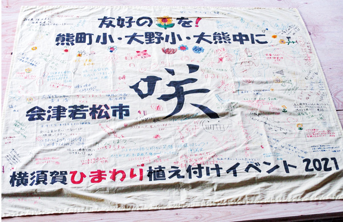 東日本大震災の影響で会津地方に避難した大熊町の人々に元気と笑顔を届けようと、震災翌年から贈り続けてきた同会。今月9日に行われたひまわりの植付けイベントには地域住民ら75人が参加し、近隣の小中学校や公園、介護施設などに苗を植えた後、会津若松市立河東第三小学校に移転している熊町小学校、大野小学校、大熊中学校の児童生徒にあてた寄書=写真=の言葉も綴り、ひまわりと一緒に届けた。