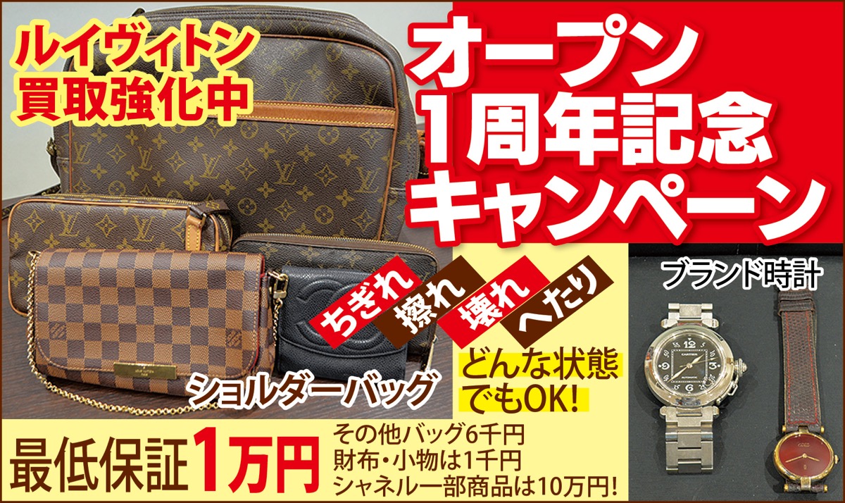 ルイヴィトンのショルダーバッグなら今だけ最低保証1万円。シャネル一部商品は10万円。ブランド時計も強化買取中。電話1本で出張買取も可能で無料査定、即現金化。高値推移の金や宝石など買取品目も多数だ。