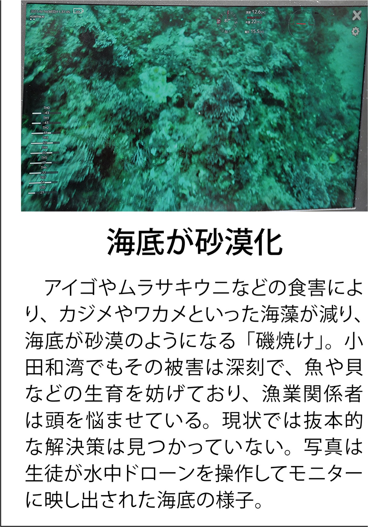今月16日には同校3年生8人が小型実習船「わかしお」に乗り込み、長井沖から1Km圏内、水深13m地点をドローンで調査。船上のモニターには海底が映し出され、磯焼けの状況を確認した。実習生の齋藤幸樹さんは「潮の流れに対応して機体を操るのに苦戦した。もっと練習し、身につけた技術を後輩に継承したい」と話した。さらに飛行ドローンも使い、藻場を海上から調べた。