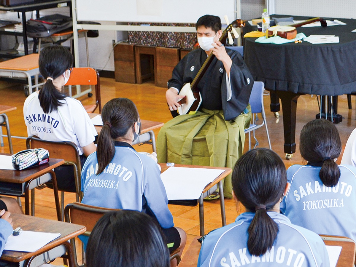 プロの音楽家が中学校に出向いて授業を行う取り組みが今月16日、坂本中学校で行われた。津軽三味線の奏者で2019年の全国大会で優勝実績のある栗原武啓さんが同校の2年生に日本古来の伝統和楽器の生い立ちや弾き方、音色の特徴などを伝えた。公益事業を行うシティサポートよこすかのアーティス派遣事業の一環。中学校音楽では和楽器が必修となっており、プロの指導で伝統文化により親しんでもらう狙いで企画された。栗原さんは、三味線が室町時代に中国から沖縄を経由して本土に伝えられた歴史的経緯や視覚障がい者の生活手段として確立された芸能文化であることを説明。「譜面が無く主に口伝で継承されきたのはそのため」だとし、歌舞伎や人形浄瑠璃の発展にも大きく寄与してきた功績を話した。