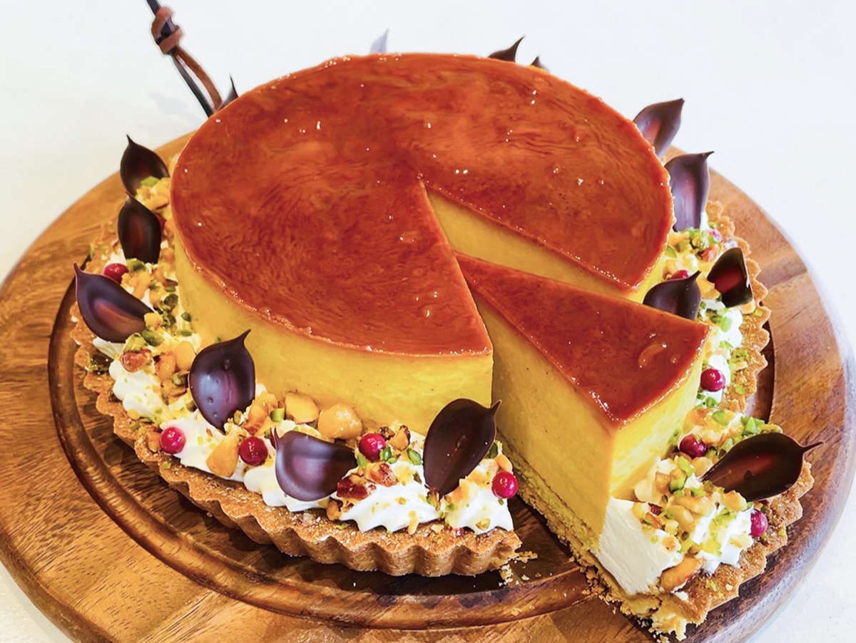 プリンタルトは、林にある「鈴也ファーム」で獲れたかぼちゃを使用している。「完熟加工のかぼちゃは甘さが強く、素材そのものの風味を味わえる」とケーキ店オーナーの栗山莉沙さん。売れ行きは好調という。