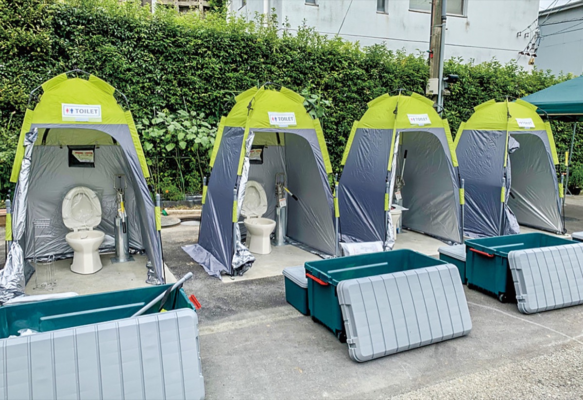 同社は、東日本大震災の被災地支援に出向いた際、避難所などで「水が使えず不衛生」「汚れや臭いが酷い」「我慢して体調を崩した」といったトイレ事情を目の当たりにした。「首都圏の人口密集地などで災害が起きると、さらに深刻になるのでは」と、井戸水を用いた水洗トイレを開発。下水管に直結する小さいマンホールを設け、この上に組み立て式のトイレを設置して井戸水で水洗する仕組みを考案した。一定量の水で流すため、便器も汚れにくく臭いも少ないという。通常時は駐車場などのスペースとして活用でき、県内では公園や区役所、物流センターなどでの施工実績がある。