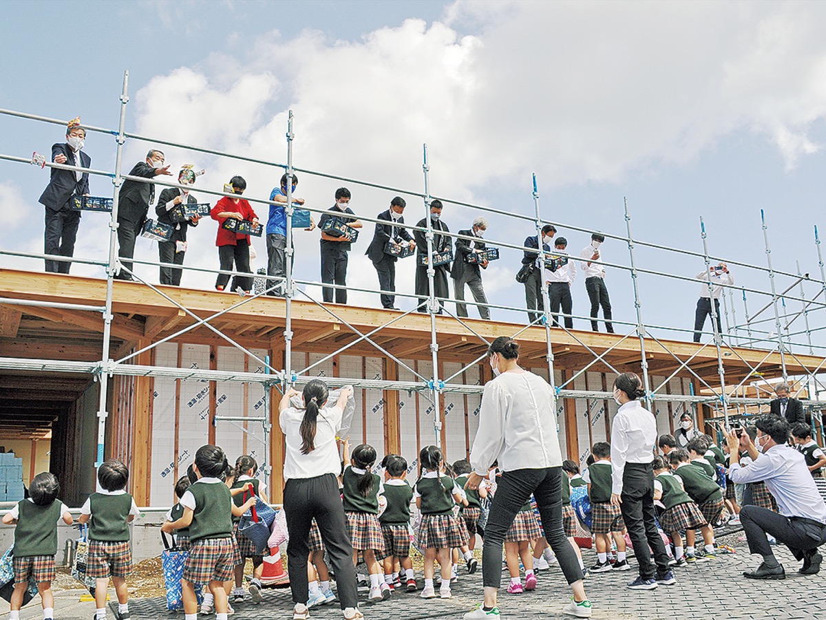 園舎の新築建て替え工事を進めている大津町の「ぎんなん幼稚園(綴喜誠淳園長)で10月4日、上棟式が開かれた。園の職員と全園児、施工業者などが集まり、工事の無事故と完成を祈願した。祝いの風習である”餅撒き”ならぬの”菓子撒き”も行われ、園児らが拾い集めた。
