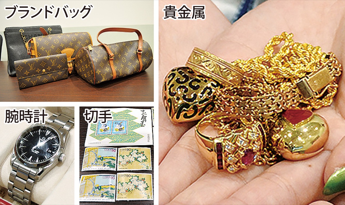 貴金属や宝石のほか、ルイ・ヴィトンのショルダーバッグなら今だけ最低保証8千円(その他バッグ6千円・小物1千円)。シャネル一部商品10万円。電話1本で出張買取にも対応している。