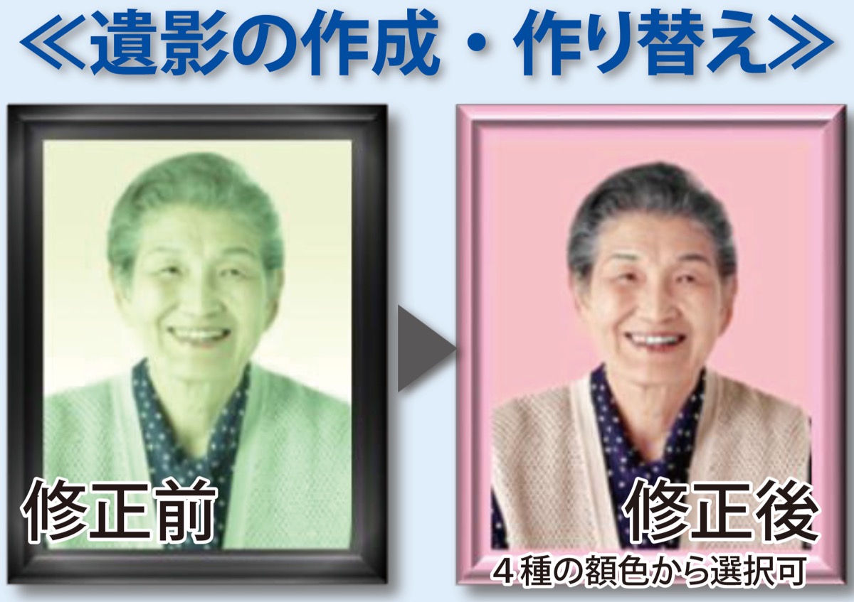 急な葬儀で慌てて用意したため、本人らしさを感じられなかったり、見栄えが悪かったりするなど遺影写真の満足度は決して高くない。ベストな写真を使用して新しく作りたい家族のニーズに応える。複数ある先祖の写真を同じサイズに整えることや白黒をカラー化することも可能だ。