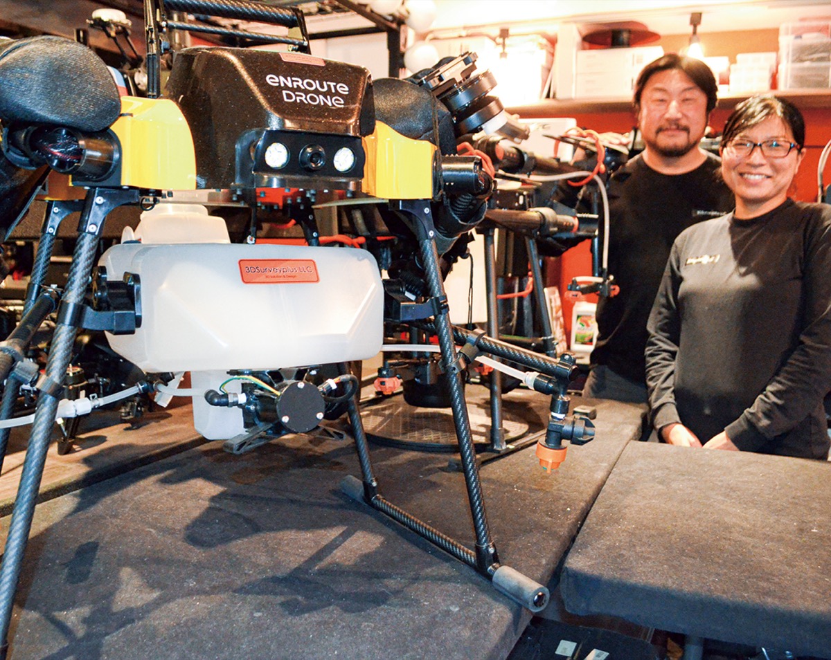堂城川厚代表は三崎出身。薬剤が入った重いタンクを背負って噴霧器で作業する農家を見て「何とか手助け出来ないか」と考えた。そこで5年前、妻・純子さんの実家である滋賀県に赴き、農業用ドローンの操縦資格を取得してスキルを磨いた。折しも、神奈川県が都市化の進展や県民感情などを考慮して自粛要請していたドローンによる農薬散布が、生産性向上に資するとして昨年末に解除となった。ゴルフ練習場の傾斜地やソレイユの丘にオープンするグランピング施設など、人力では危険が伴い、重労働が予想される土地に除草剤を散らす仕事を受注した。国の補助金約600万円で専用機を2種購入。30リットル撒くのに約3時間掛かっていた作業が約20分で完了した。ヘリと比べても静かで狭いエリアでも対応可能という。