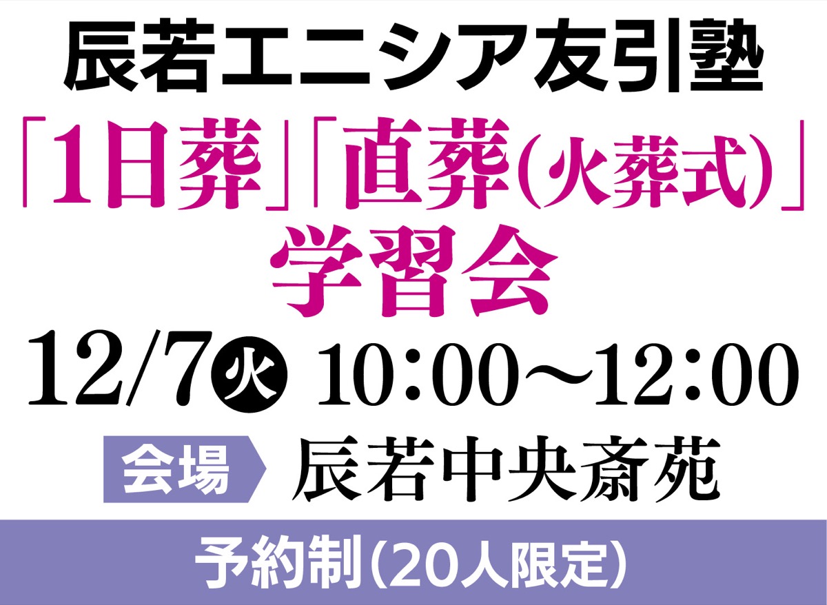 地元葬儀社の辰若では12月7日(火)、近年増加傾向にある「1日葬」「直葬(火葬式)」をわかりやすく解説する学習会を開く。選ぶ前に知っておきたいポイントが学べる。年内最後の実施。会場は辰若中央斎苑(米が浜通2の1)で参加無料。