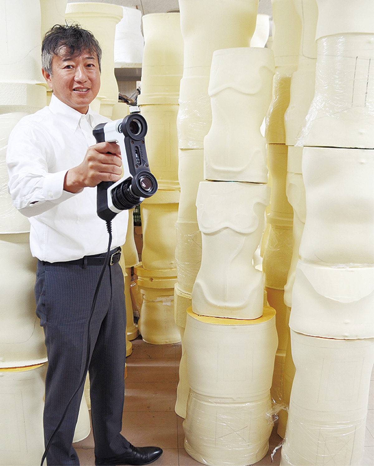 車椅子や介護ベッド販売、バリアフリー住宅提案などを手掛ける同社。グループ会社には(有)湘南義肢研究所があり、病院から依頼を受け、体幹部に装着するコルセットを製造している。すべて一人ひとりの形状に合わせたオーダーメイドで、従来は職人の手で石膏を削って型を取り、その型紙から作った幾つものパーツを縫合して完成となる。ただ1日10枚作るのが限度。”患者第一”の医療現場からは待ったなしで注文が入り、生産が追いつかなかった。
