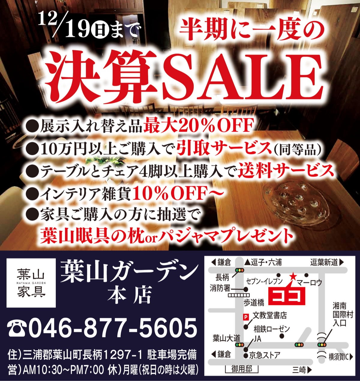 オリジナル無垢板家具で多くのファンを獲得している葉山家具本店では、現在、半期に一度の決算セールを開催している。12月19日(日)まで。
