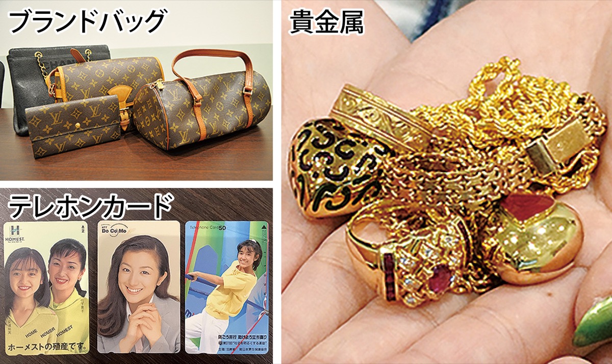 貴金属のほか、ルイ・ヴィトン製品バッグは今だけ最低保証8千円(財布・小物1千円※セカンドバッグは小物扱い)。シャネル一部商品は10万円。テレホンカードも買取強化中。プレミア付きの品もあるが、スマホ等の普及で価値が下がりつつあり「早めの現金化を」と呼び掛けている。
