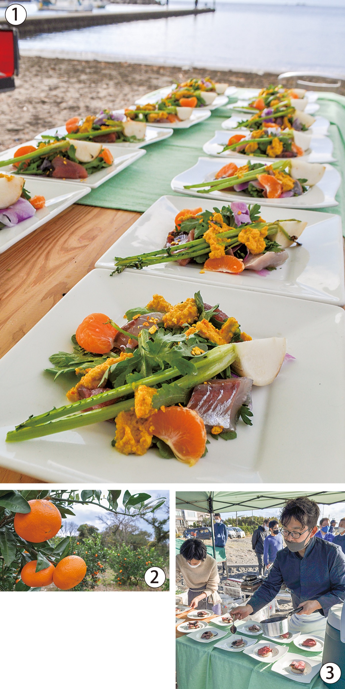その後、砂浜に着くと、目の前に海が広がるロケーションにテントが張られ、吉田さんがこの日のために考案したメニューを調理。潮風とともに食欲をそそる香りを辺りに漂わせていた。しばらくすると、大楠漁港で水揚げされたカツオ・マアジ、紅みかんのサラダ、佐島産タコのパスタや横須賀牛と三太郎大根のステーキなど、色彩豊かな品々が順番にテーブルへと運ばれ、参加者は心ゆくまで賞味した。