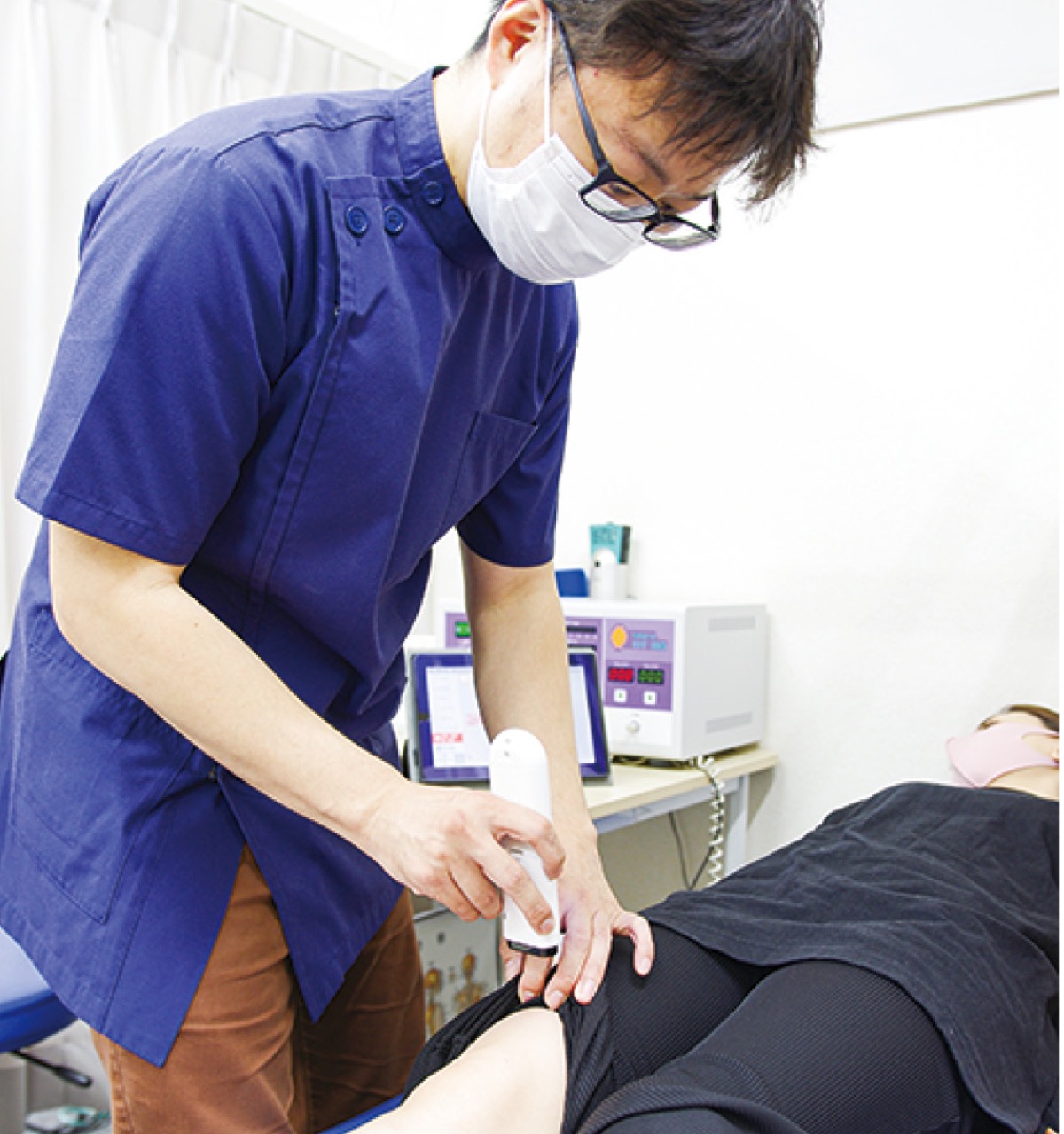 三春町の「やまもと接骨院」ではコロナ禍を機に非接触型の新機器を導入。電位差や温度差などを基に痛みの原因を細かく分析し、東洋医学の観点も取り入れ、同療法で痛みへアプローチ=写真。根本的な改善へと導く。「人により痛みの原因も千差万別。いろいろな手段を試してみてほしい」と山本拓野院長。予約優先、在宅対応可。