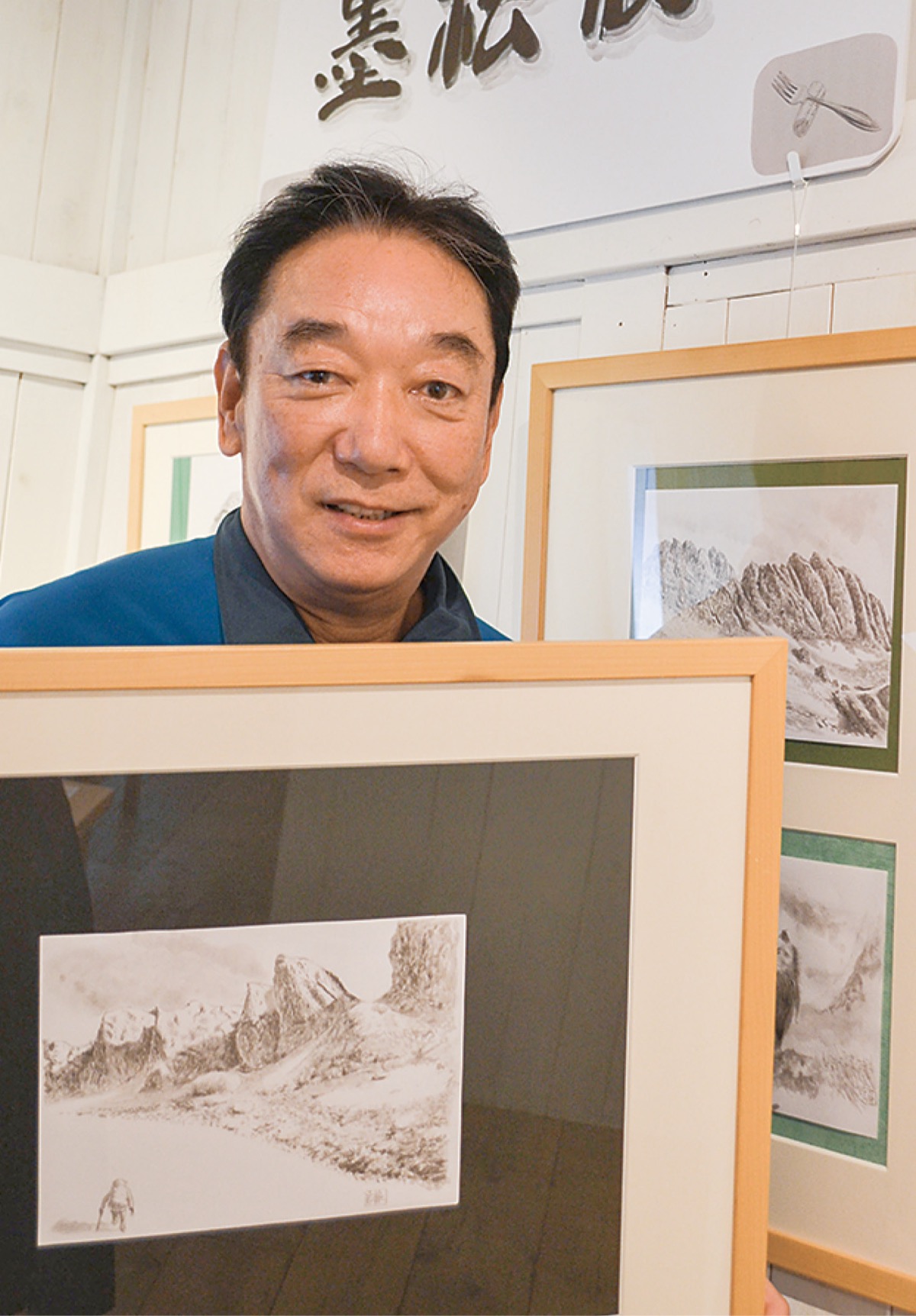 「墨絵」を始めたのは1年半ほど前。アウトドアメーカーが開発した「野筆」を手に風景などを描きためるようになった。「白黒の世界はおもしろい。湯気や影など濃淡を表すには決意が必要で」とほほ笑む。登山の旅先や自宅で数時間かけながらイメージを膨らませたり。「蕎麦を描くときは食べているような、温泉は湯に入っているような気持ちになるからいいね」。およそ15年、毎日更新しているブログとともに、「絵や文章で表現することで世の中を見る目が増えた」と語る。