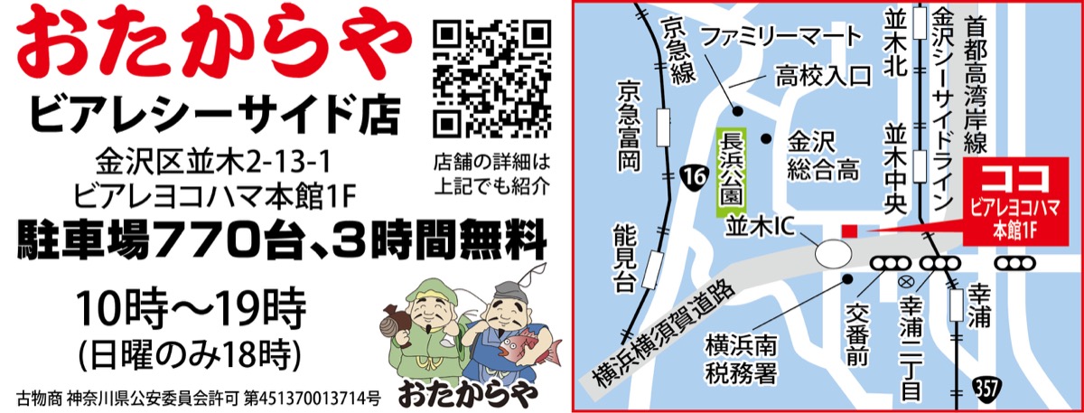 横浜横須賀道路の並木ICからすぐの商業施設「ビアレヨコハマ」本館1階にある買取専門店「おたからやビアレシーサイド店」では、出張買取キャンぺーンを実施中。無料で自宅を訪問し、さまざまな品の査定に対応している。