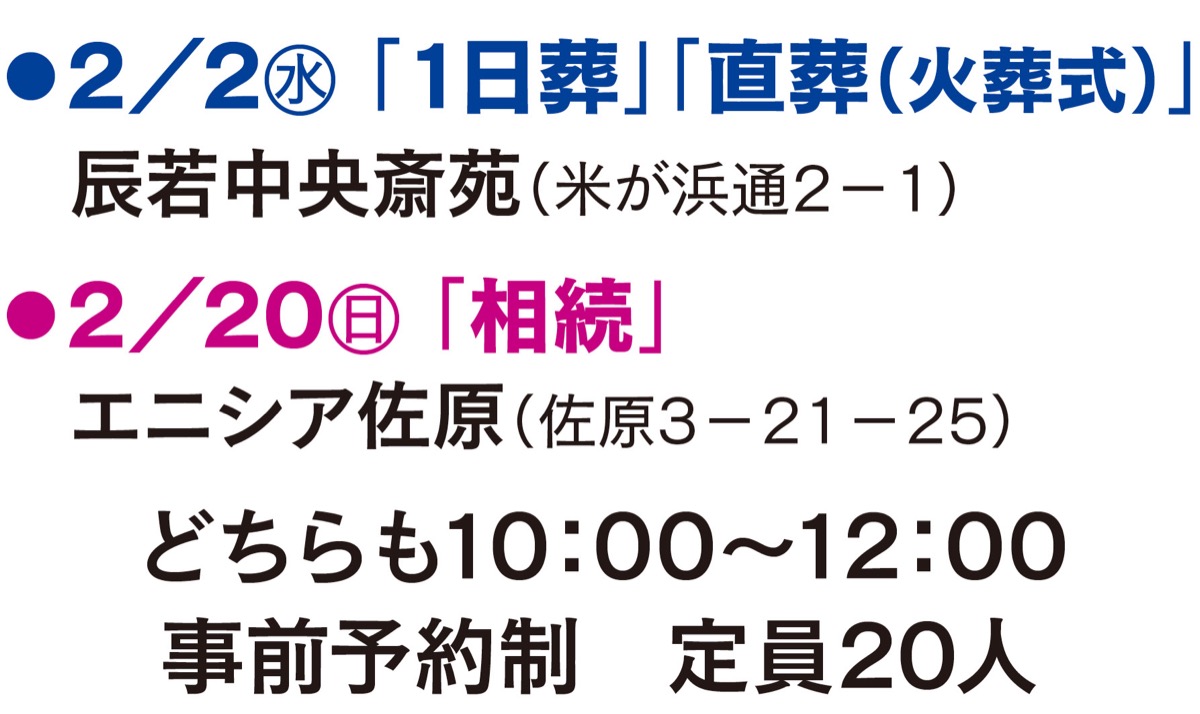 葬儀全般の疑問や質問に応じる個別相談会を1月23日(日)・29日(土)・2月2日(水)・8日(火)・14日(月)・20日(日)に実施する。費用無料。辰若中央斎苑、エニシア佐原、辰若本社、エニシア米が浜の4会場。午前10時から午後2時で予約制。