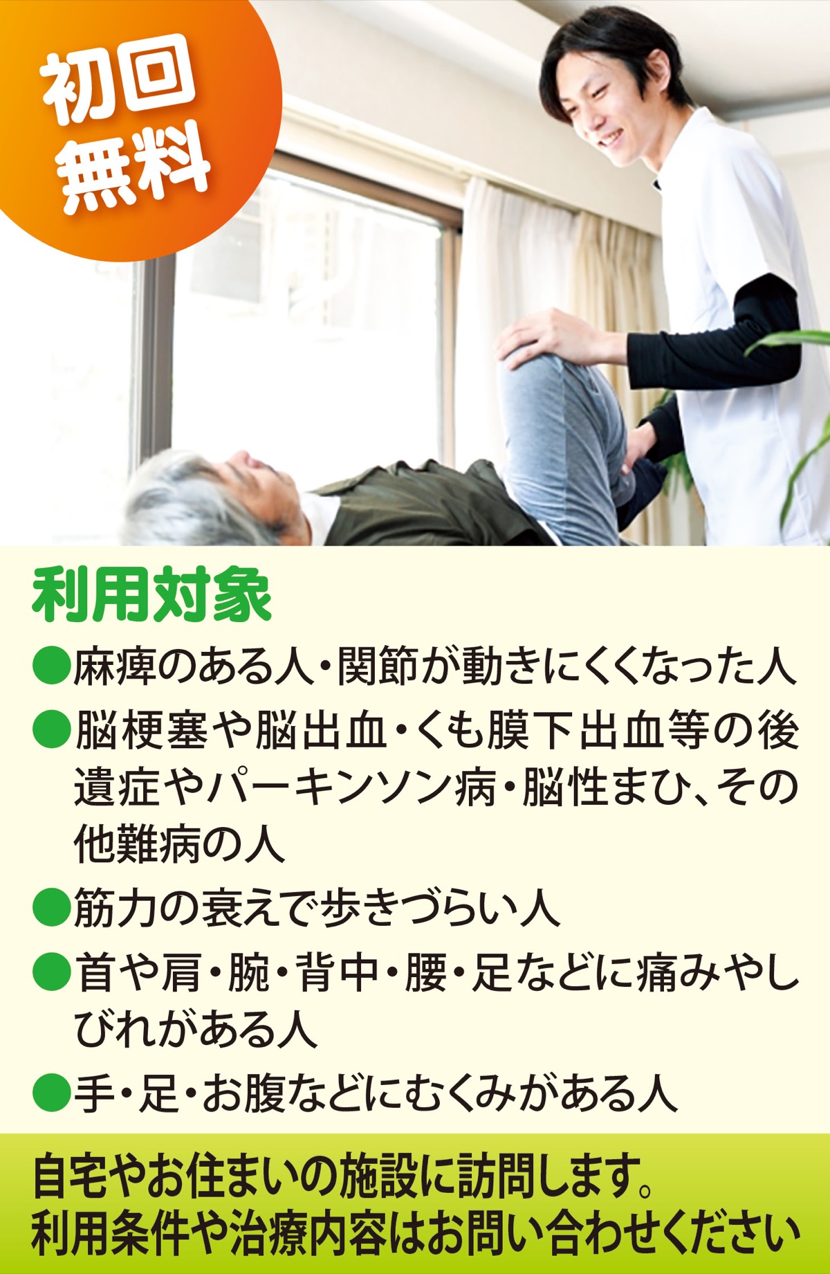 歩行困難などを理由に通院ができない人を対象にしたサービスで、事故や病気の後遺症で麻痺や痛みがある、筋力の衰えで歩きづらい、首や肩・腰に慢性の痛みやしびれがある…などの症状に対して「関節の動く範囲を広げること」が目標。本人の身体の状態を見ながら、機能訓練やはり・きゅう・もみほぐしなどを施術する。
