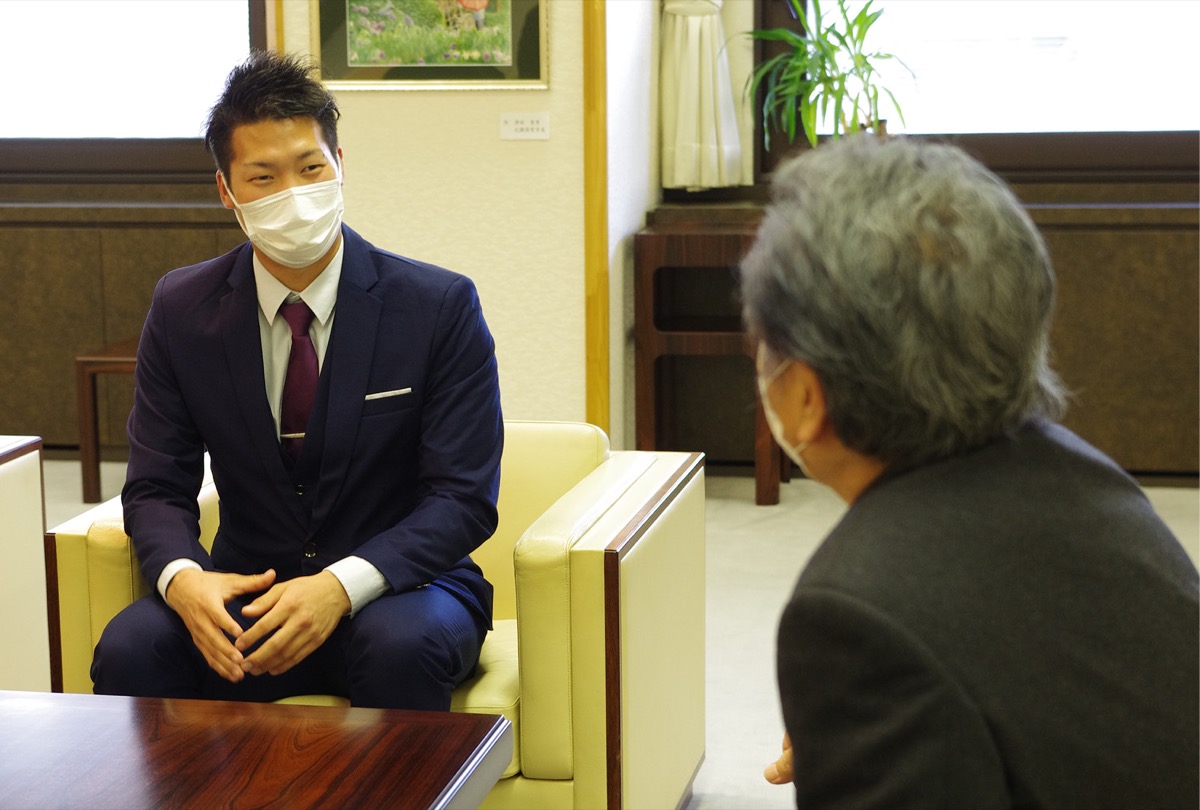横須賀市出身で、プロ野球独立リーグの「神奈川フューチャードリームス」に今年移籍した大高歩さんが1月18日、上地克明横須賀市長のもとを表敬訪問した。