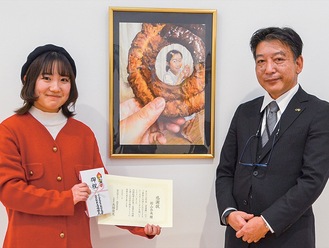 ドーナツの穴から覗いた幼い妹――。横須賀美術館で開催中の特集「横須賀市立横須賀総合高校 美術活動の歩み」で展示されている作品『望遠鏡』(全日本高校デザイン・イラスト展内閣総理大臣賞)の作者である岡山奈央さん=写真左=に1月14日、ミスタードーナツを運営する(株)ダスキンから感謝状が贈呈された。