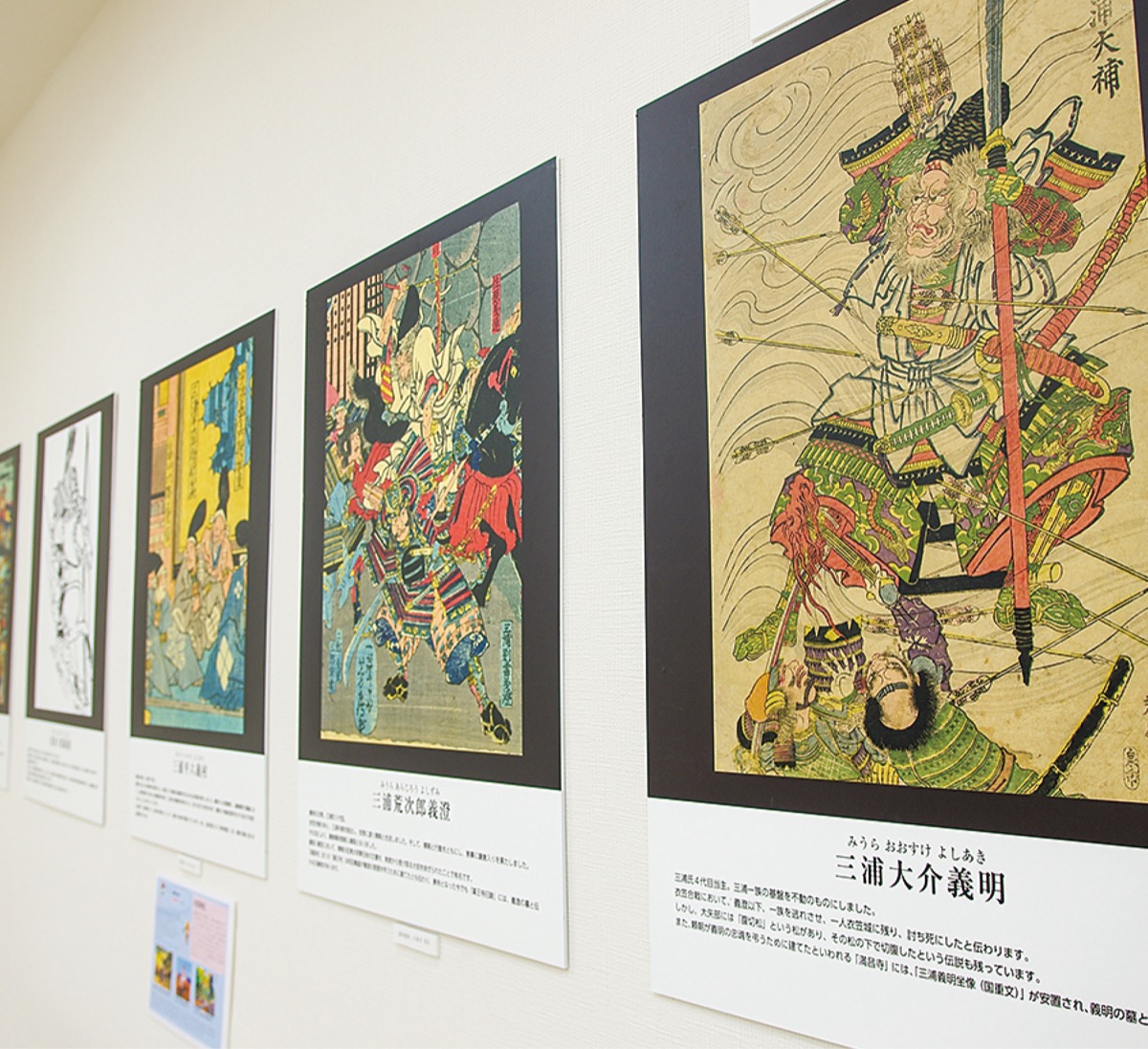 一族の歴史の中でも今回は平安末期から鎌倉時代が舞台。衣笠を拠点に躍動した一族中興の祖・三浦義明をはじめ、子の義澄、佐原義連、孫の義村、和田義盛らを中心に、浮世絵と合わせて略歴を紹介。また市内に現存する各人物ゆかりの寺院や史跡、墓所などもパネル写真を用いて解説している。