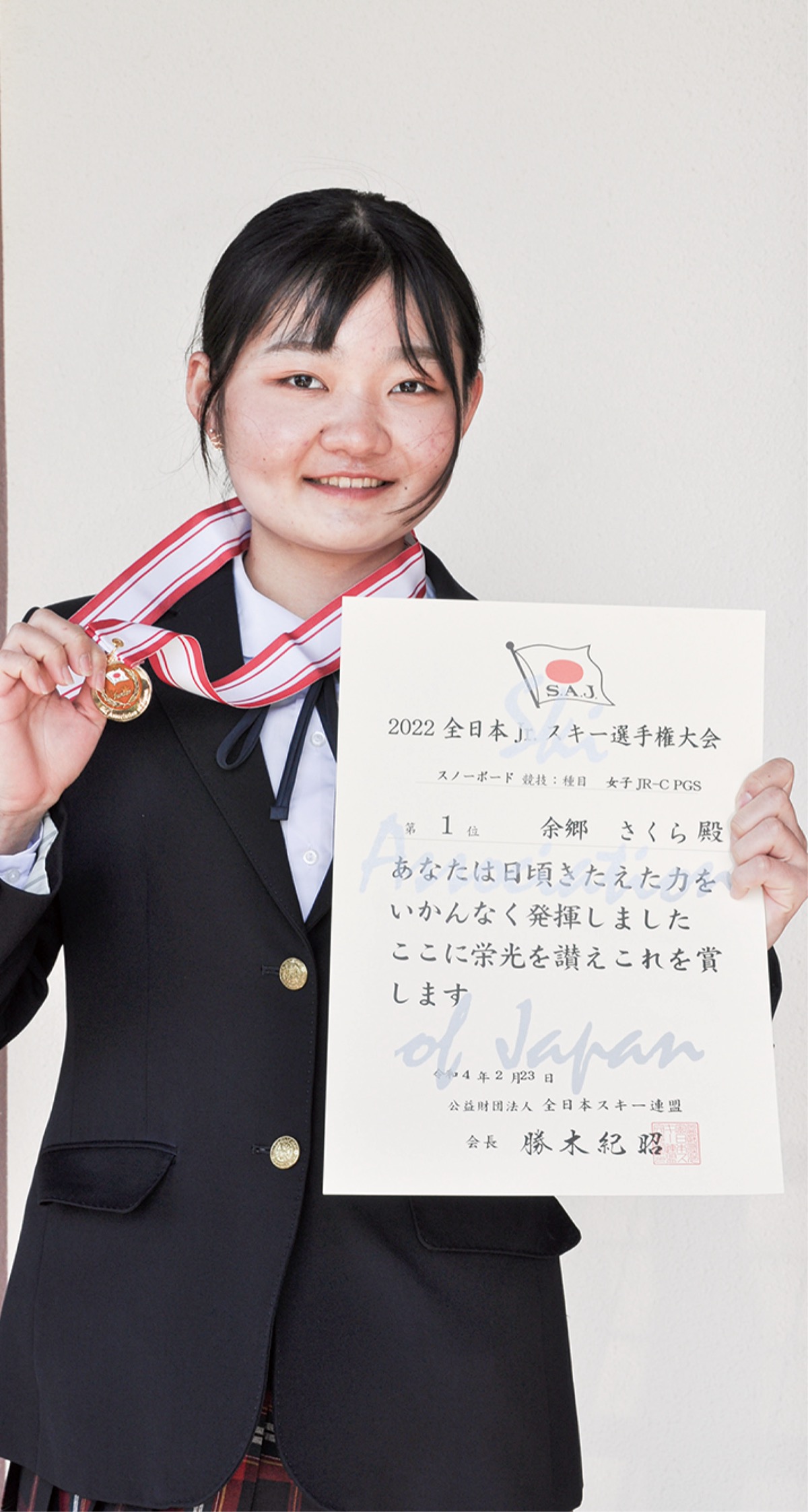 津久井在住で法政大学国際高校3年の余郷さくらさん=写真=が、2月23日に北海道釧路市の阿寒湖畔スキー場で開かれた「全日本ジュニアスキー選手権大会スノーボード・アルペン競技」に出場し、念願の優勝を果たした。同競技は雪山につくられた傾斜のあるコースを滑り降りてタイムを競うもの。余郷さんは高校生年代までが参加するクラスで最高峰の順位を獲得した。