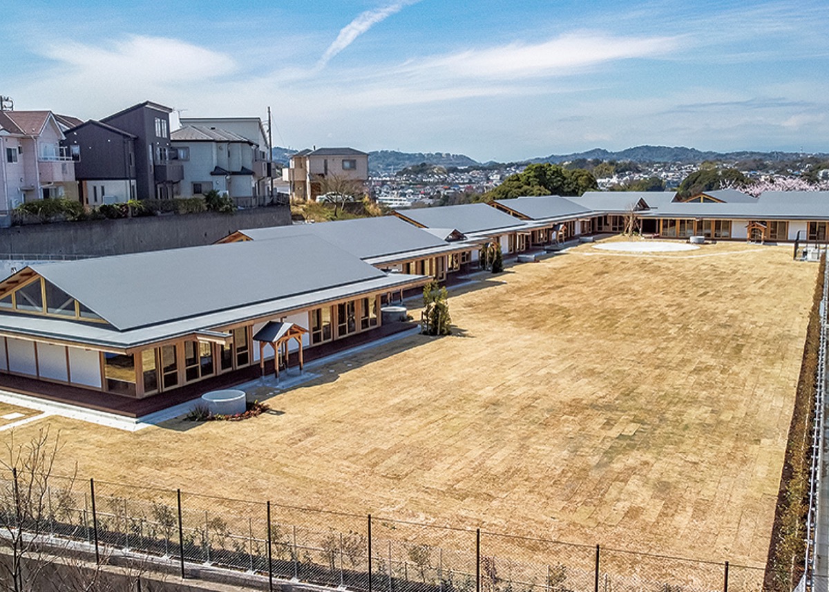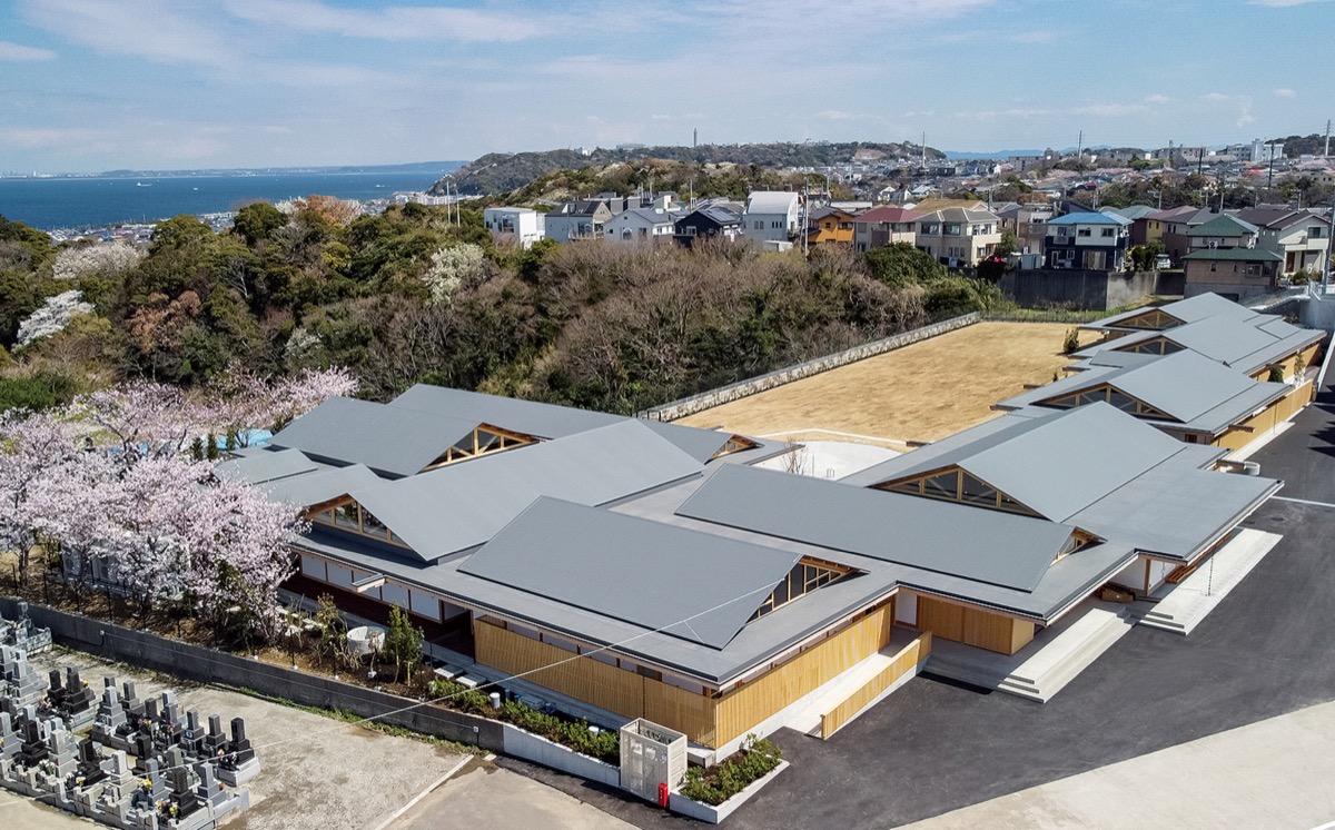 幼稚園の園舎だと聞かされたら耳を疑うだろう。格式のある和モダンの建物はまるで迎賓館や高級旅館の佇まい。玄関口から一歩足を踏み入れると天然木ならではやさしいの風合いが訪れた人を出迎えてくれる。東京湾と猿島を眼下に望む大津の高台に、信誠寺が運営する「ぎんなん幼稚園」(大津町3の29の41の1)の新園舎が完成した。約4900平方メートルという広大な敷地を活かした平屋スタイルに壁をなくして開放感を高めた外廊下など、斬新な設計で”お寺の幼稚園”の新しいイメージを打ち出している。