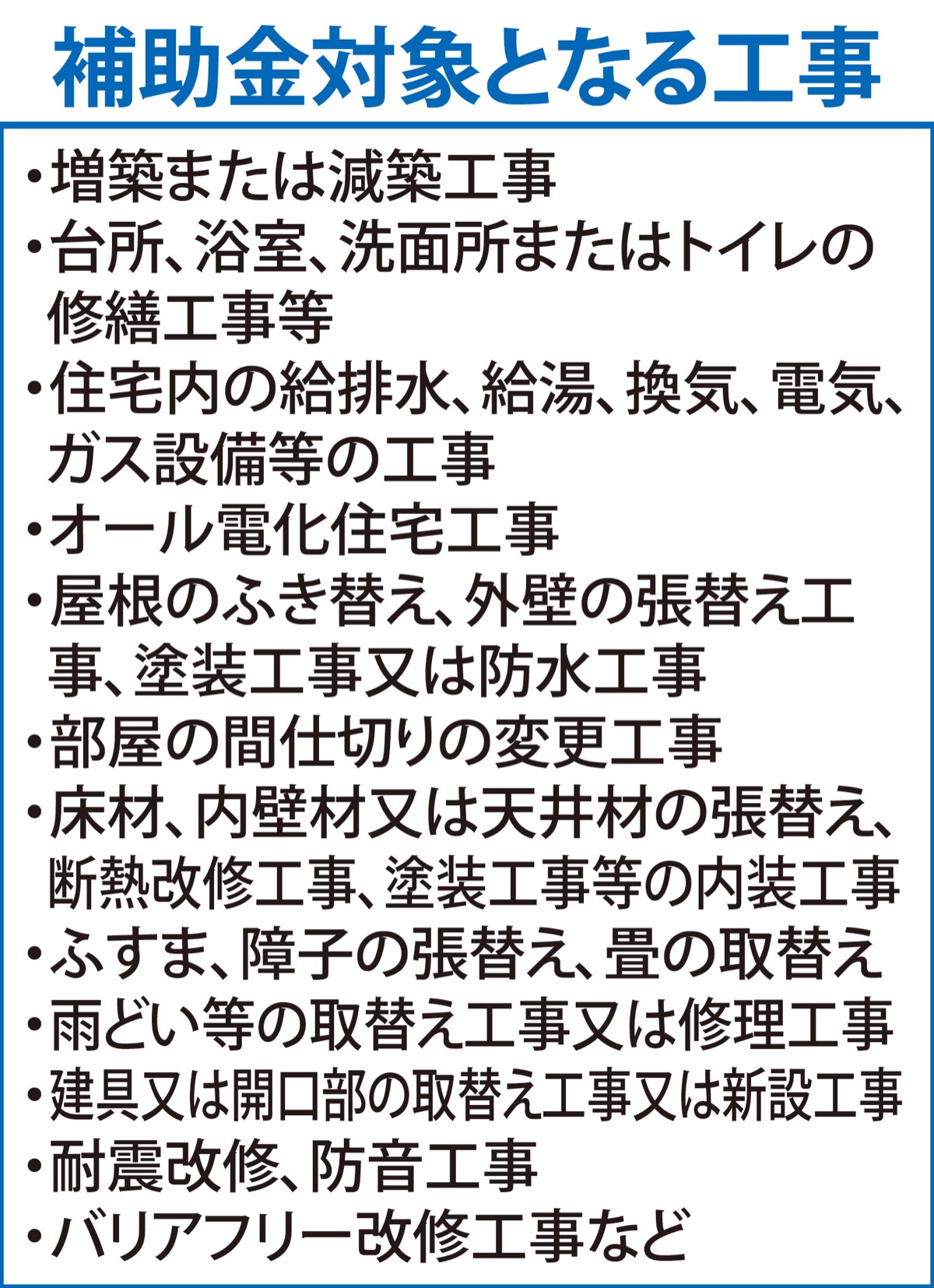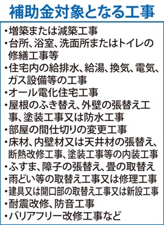 対象者は市内で住宅を所有する65歳以上の市民(同居も可)。戸建住宅や共同住宅の専有部分などで、補助するのは住宅内の修繕工事全般。増築や減築、水回りの修繕、オール電化、屋根や外壁の塗装、断熱、防音、耐震工事などが対象でバリアフリーの改修も含まれるが、他の助成制度との併用は不可となる。2023年3月31日までに完了し、市内に本拠(本店)がある事業者が施工することが条件となる。