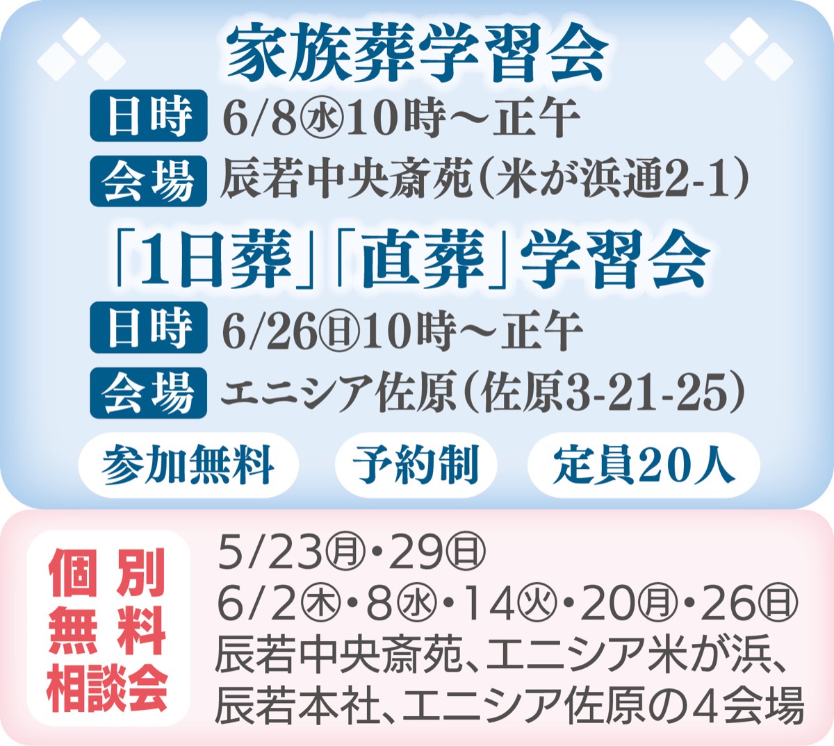 地元葬儀社の辰若では、これらの葬儀形態をを正しく理解するための学習会を開く=日程は左表参照。情報収集の場を用意することで、失敗や後悔を避けてもらう狙い。参加は無料。
