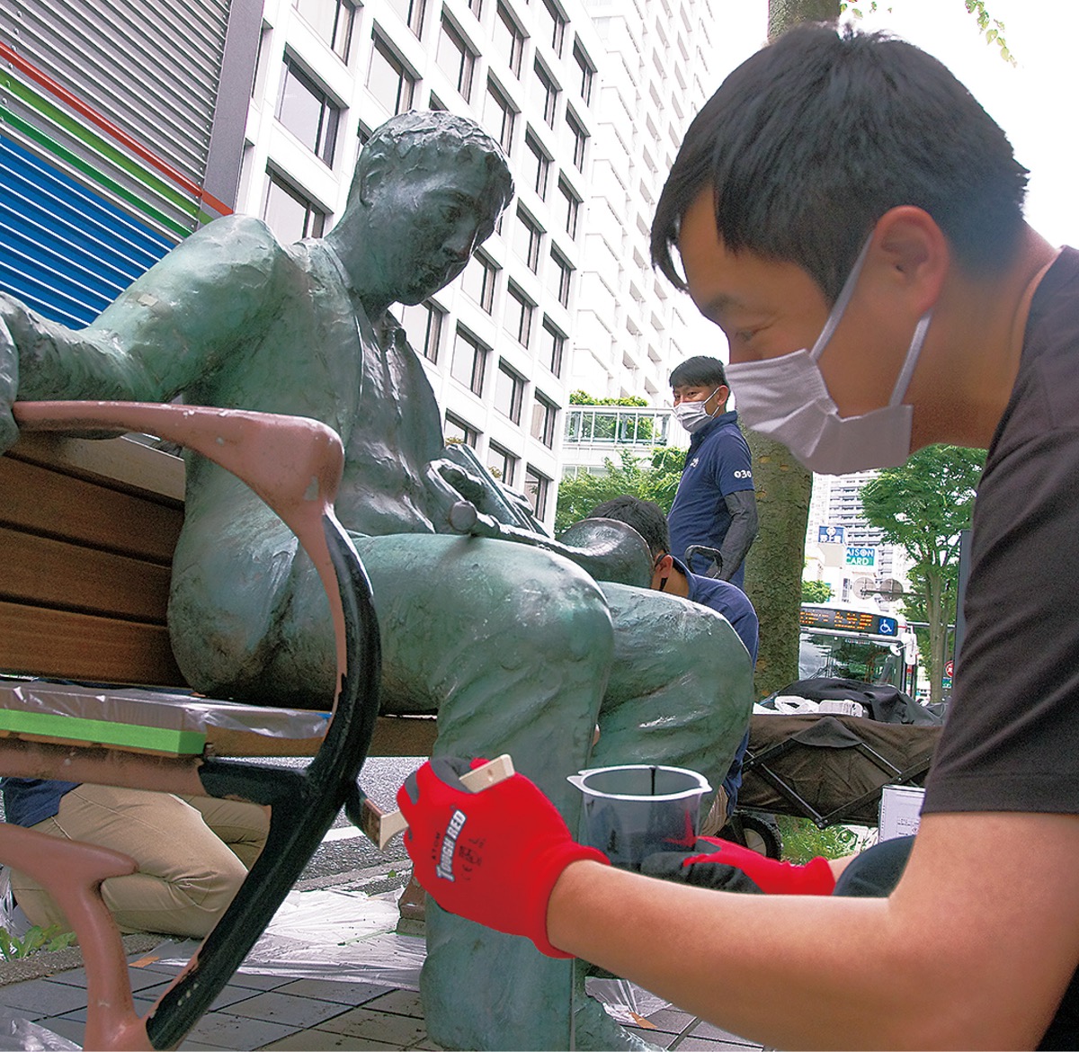 同地区商店街の若手組織「ヨコスカダウンタウンクラブ」を主体に、街づくり団体「横須賀青年会議所」が協力。ブロンズ像は1987年に開かれた市政80周年記念イベントに端を発し、「横須賀の文化を語り継ぐシンボル」としてバス通り沿いのベンチとYデッキ花壇に計7基設置されている。6月7日には仕上げとして像が腰かけるベンチ4基を塗り直した。同クラブ代表理事の藤原道和さんは「横須賀の玄関口・中央の観光のシンボルとして、これからもみんなで大切にしていきたい」と話した。