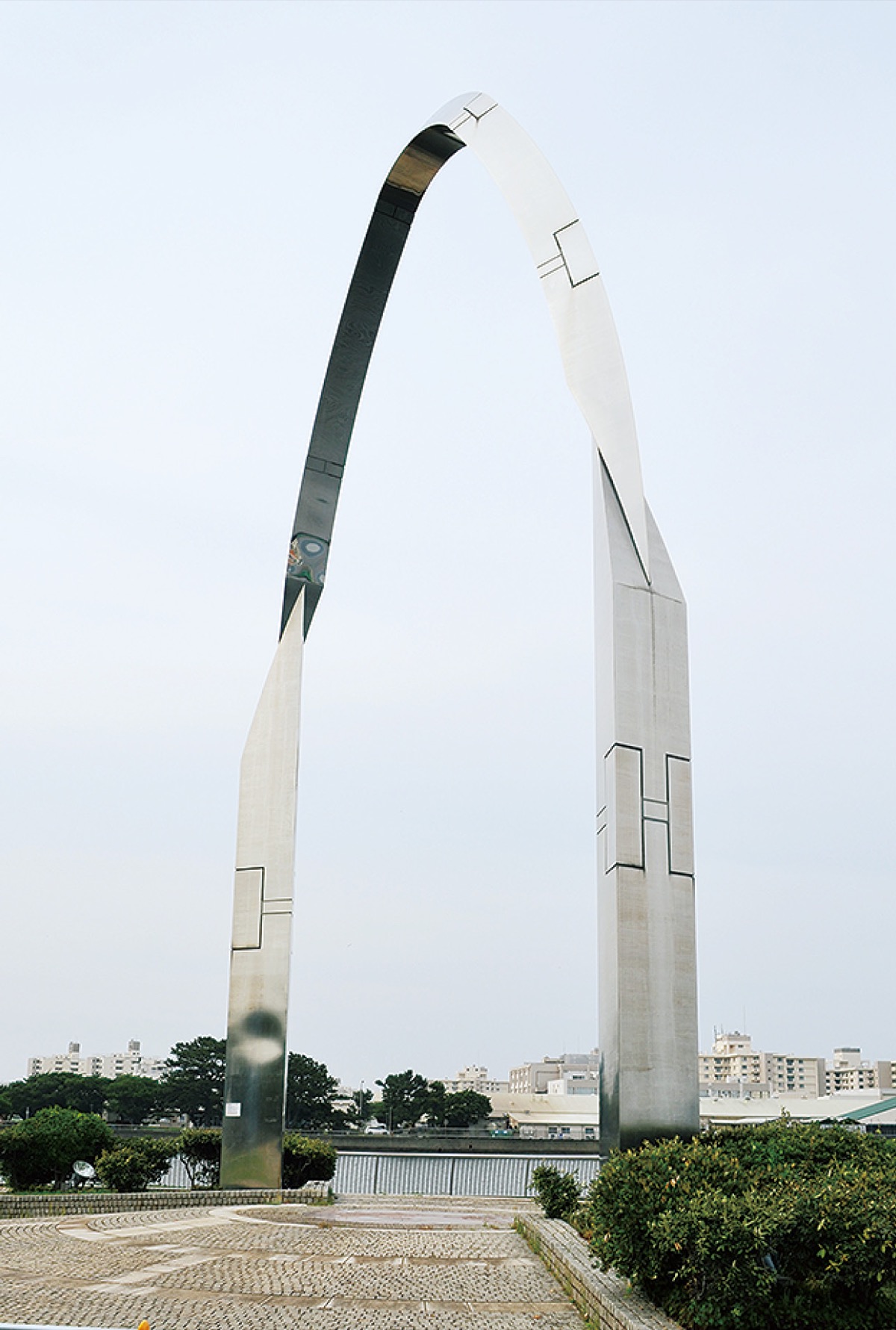 三笠公園の野外ステージ近く、海を臨む場所にある「モニュメント」は老朽化のため2022年度中に解体・撤去される方向。80年代の大改修の際に設置されたもので、「平和のアーチ」と呼ばれる高さ18m×幅10mの構造物。主要部材や接合部の劣化や腐食が進んでおり、市は修繕か撤去かを検討していた。部材が落下する可能性があるため、現在は周囲を立ち入り禁止にしている。今後は、モニュメントの記録を残す方法も検討していくという。