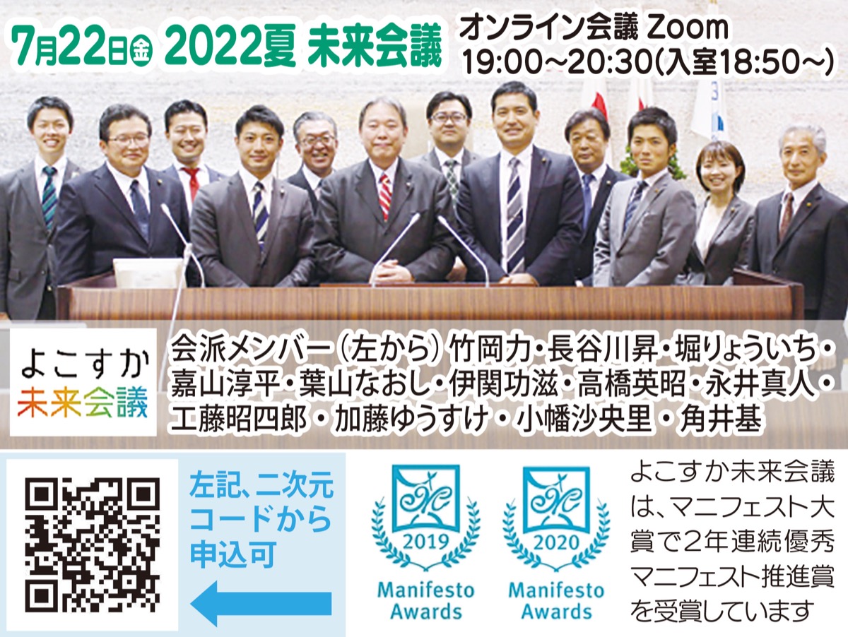 市議会会派・よこすか未来会議は、結成時に示した政策集(マニフェスト)の実現に向けて取り組んでいます。コロナ禍で人との交流が難しい時期が続きましたが、音楽や芸術などの文化やスポーツを活かしたまちづくり、観光など、人と触れ合いまちを明るくする政策を進める必要があります。皆様からの「横須賀市で、こんなことができるのでは?」という提案を是非お聞かせいただきたく、「2022夏未来会議」を7月22日(金)に開催します。
