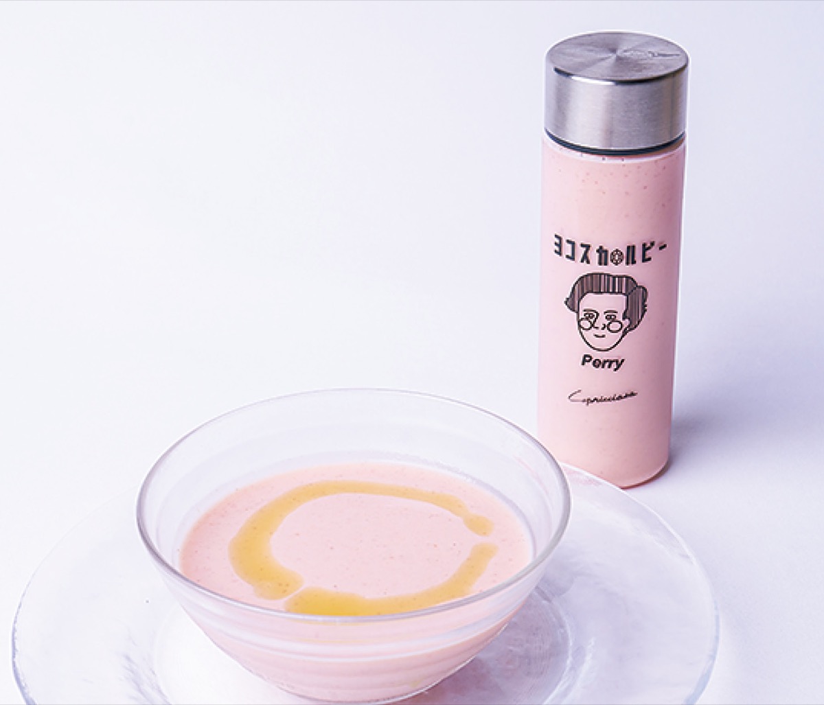 馬堀町在住で横須賀総合高校2年生の倉澤ひよりさんが考案したピンク色をしたジャガイモの品種、ノーザンルビーを使った冷製スープ「ヨコスカ・ルビー」。これをカプリチョーザトマト&ガーリック横須賀モアーズ店が、夏季限定メニューとして7月16日(土)から販売する。長浦町の農家、垣内清美さん(ちーちゃんファーム)が材料となるノーザンルビーを提供、地産地消メニューであることもアピールする。