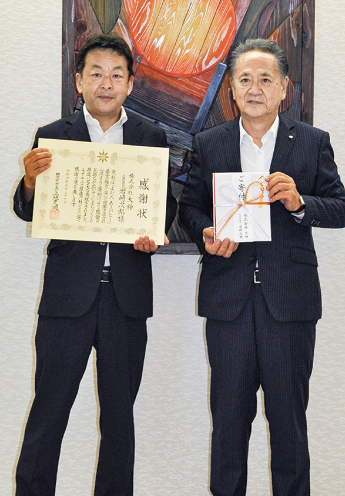 総合建設業の株式会社大神(本社=大矢部)は、横須賀市が昨年6月に創設した「よかった ありがとう。」基金に30万円の寄附を行った。7月26日に同社の岩崎次郎代表取締役が市役所を訪れ、上地克明市長に手渡しした。