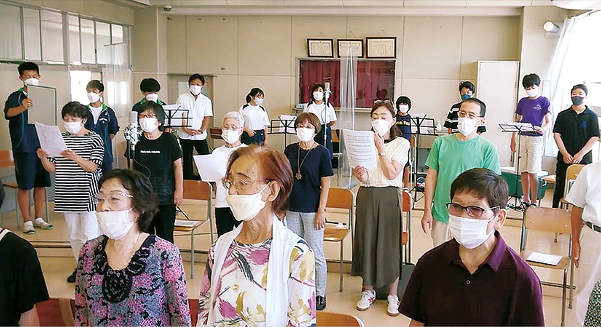 CD作成のため、7月末に行われた合唱の録音には、原曲を制作した富士見小卒業生ら武山中生徒と同連合町内会の有志約25人が参加=写真。息の合ったハーモニーを響かせた。さらに民踊教室師範による振り付けを地元の民踊愛好家たちが踊った動画を撮影。当初は8月の盆踊り大会での披露を予定していたが、新型コロナの感染再拡大で中止に。齊藤会長は「時期を改めて地域でお披露目できる機会を設けられたら」と話した。