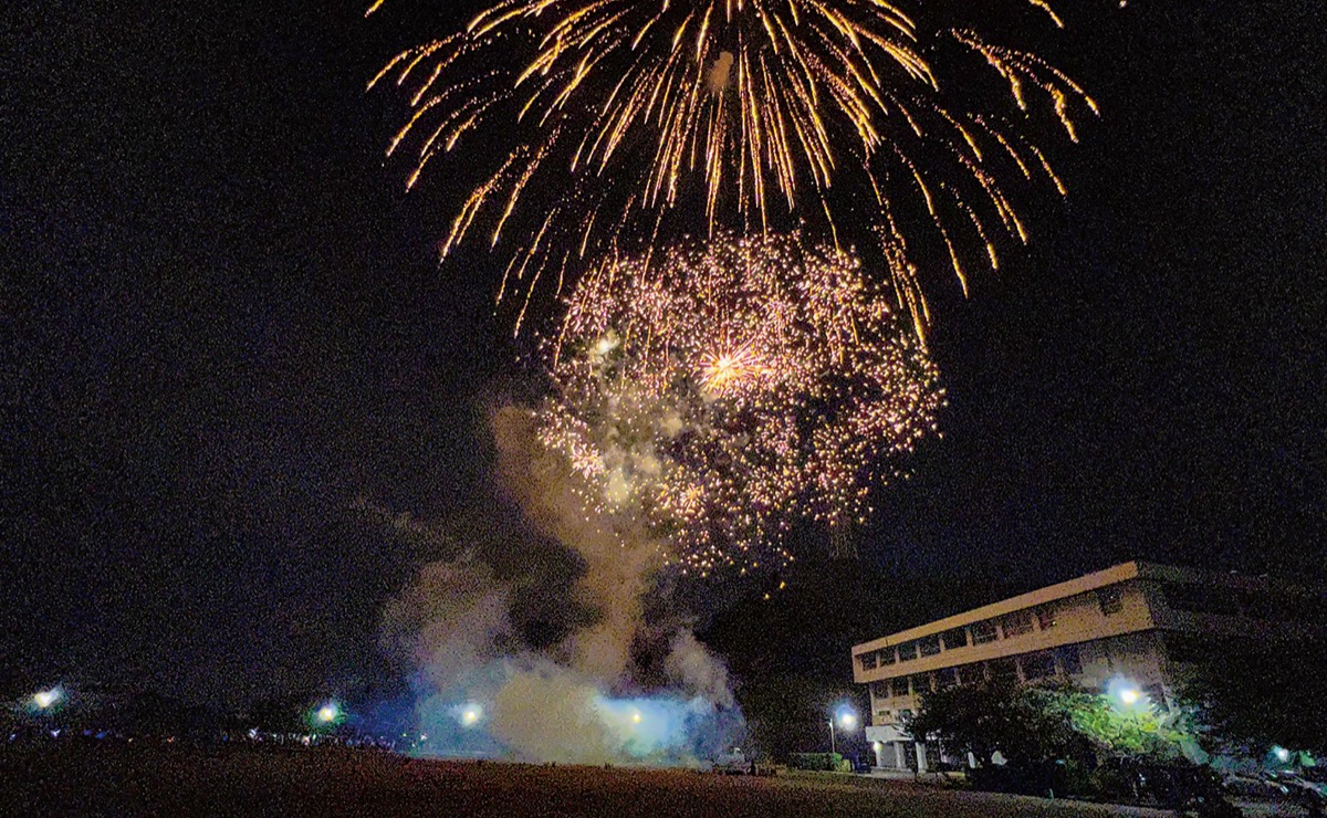 岩戸中学校グラウンドを会場に、大小約500発の打ち上げ花火と長さ約70mのナイアガラ花火を音楽に合わせて次々と点火。晩夏の夜を鮮やかに染め上げた。