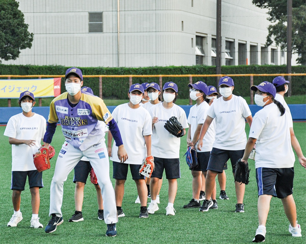 試合終了後には、市内出身の大高歩選手などから直接指導を受ける場面も。生徒らは人工芝の感触を確かめながらノックを受けた。野球部キャプテンの二瓶斗さんは「打球も送球もプロのスピードは桁違い。刺激を受けた」と話していた。