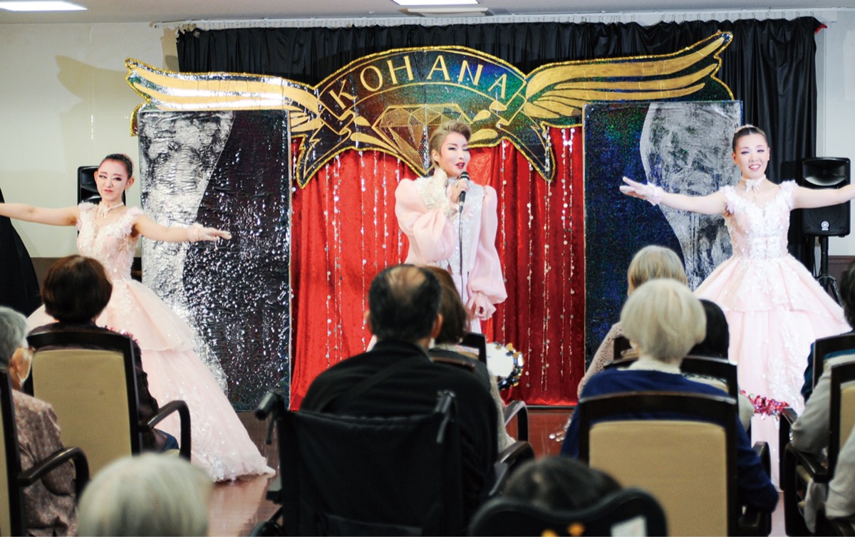7月にネクサスコート青葉台(横浜市青葉区)を訪れた呼華歌劇団は、約50人の入居者を前に歌舞伎舞踊や昭和の名曲、シャンソンを披露。企画した同社の逆瀬川真一さんは「ご入居者様に喜んでもらえてよかった」と振り返った。